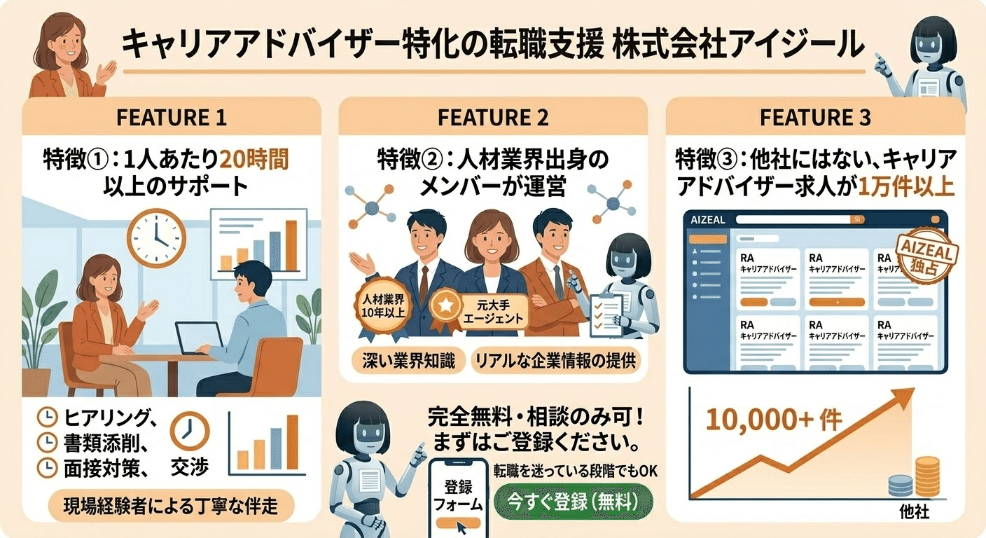 弊社、株式会社アイジールでは、キャリアアドバイザー特化の転職支援を行っております。