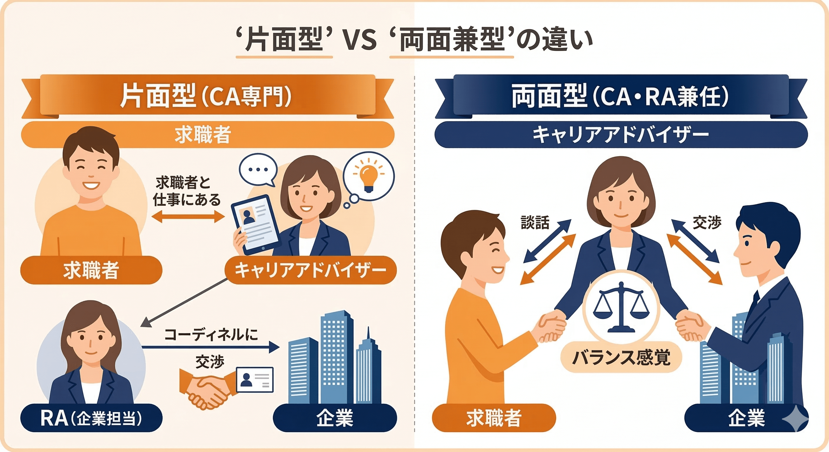 キャリアアドバイザーを目指す上で、必ず理解しておきたいのが「片面型」と「両面型」の違いです。この区別が、求められるスキルや仕事の難易度に大きく影響します。