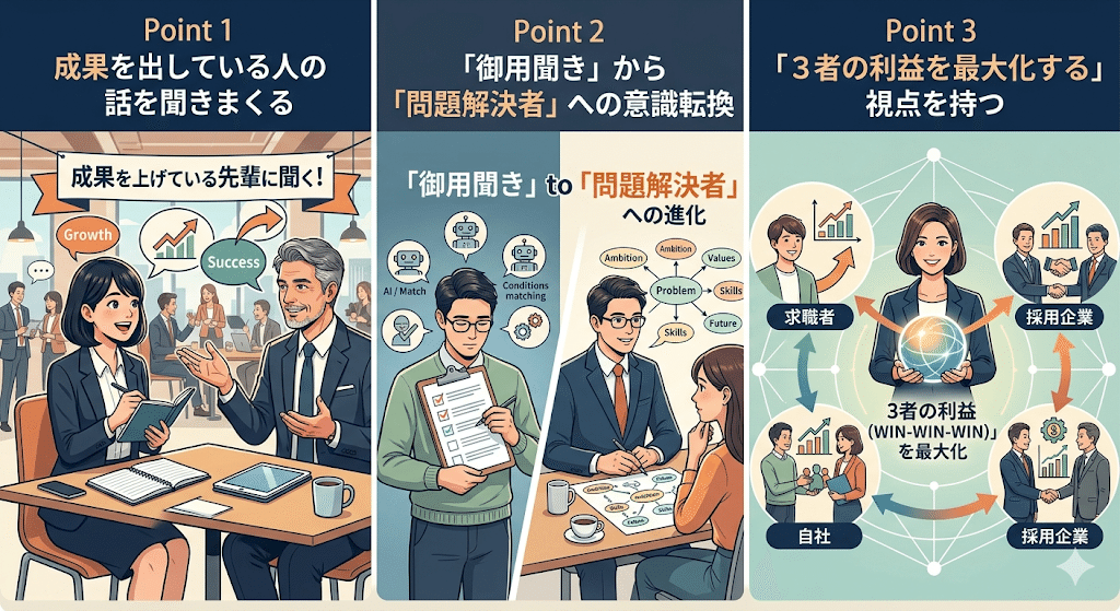 CAとして長く活躍し続けている人には、共通した考え方があります。それは、「自社・求職者・採用企業、三者の利益が最大化されるように動く」 という視点です。